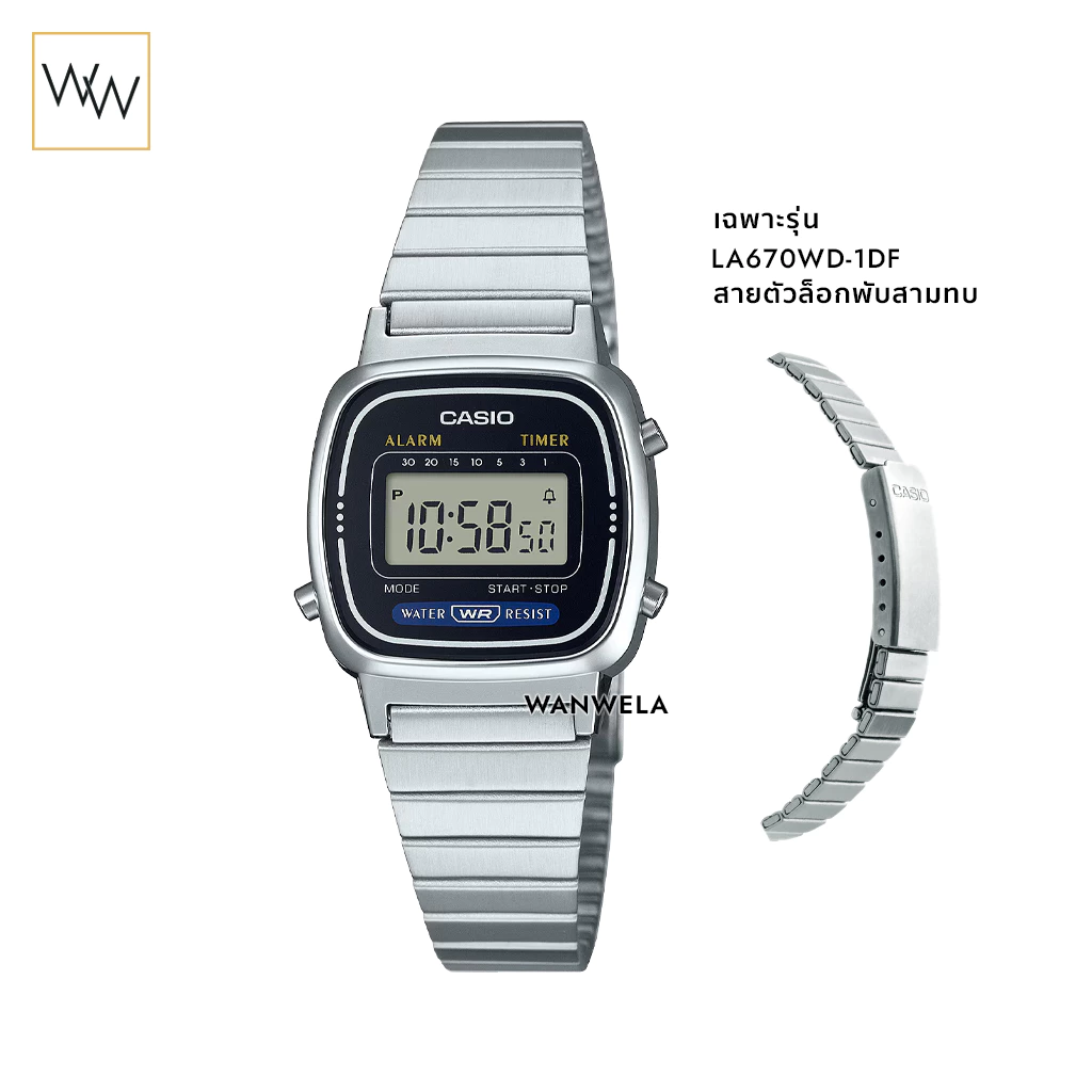 สัมผัสไอเทมระดับ Iconic กับ Casio LA670WD Series นาฬิกาดิจิทัลตัวเรือนขนาดเล็กที่ครองใจสาวๆ ทั่วโลกมาอย่างยาวนาน โดดเด่นด้วยดีไซน์หน้าปัดทรงเหลี่ยมสุดวินเทจ จับคู่กับสายสแตนเลสสีเงินเงางามพร้อมตัวล็อกพับสามทบ มอบลุคที่ดูย้อนยุคแต่แฝงไปด้วยความทันสมัย (Retro-Chic) เป็นนาฬิกาที่ไม่ว่าจะผ่านไปกี่ปีก็ยังดูดี และเข้าได้กับทุกสไตล์การแต่งตัว
