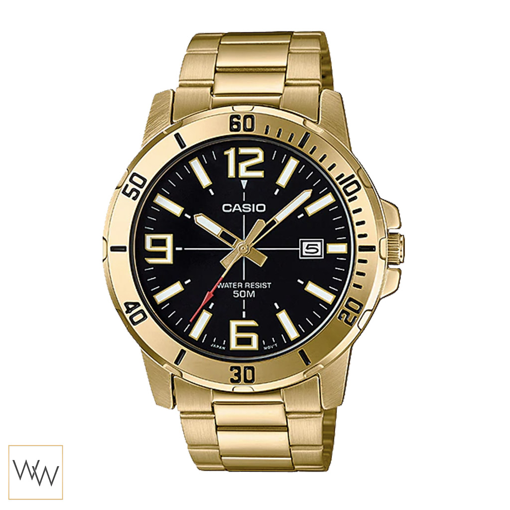 นาฬิกา Casio รุ่น MTP‑VD01G‑1BVUDF หน้าปัดดำคลาสสิก ตัดกับสายและตัวเรือนชุบไอออนสีทอง ระบบควอตซ์ที่น่าเชื่อถือพร้อมเข็มและหลักเวลาที่เรืองแสง และฟังก์ชันวันที่ มาพร้อมการกันน้ำระดับ 50 เมตร ตัวล็อกแบบพับสามทบ แข็งแรงทนทาน เหมาะกับสไตล์ทั้งลำลองและทางการ
