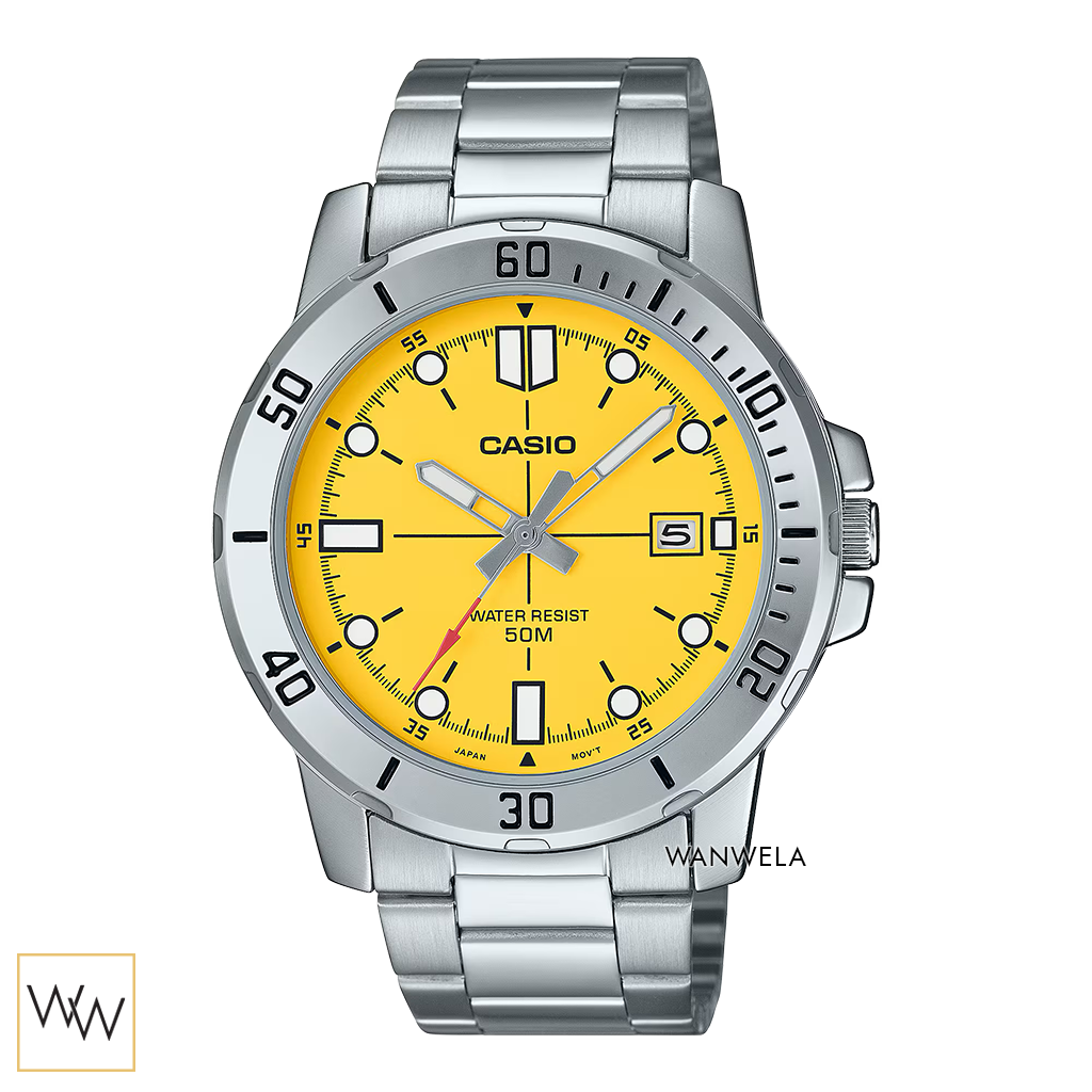 นาฬิกา Casio รุ่น MTP-VD01D-9EVUDFนาฬิกาผู้ชายที่ผสมความสปอร์ตกับความเรียบหรูในตัวเดียวกัน โดดเด่นด้วย หน้าปัดสีเหลืองสดชัด ตัดกับตัวเรือนและสายสแตนเลสสีเงิน ให้ลุคทันสมัยแต่คลาสสิก